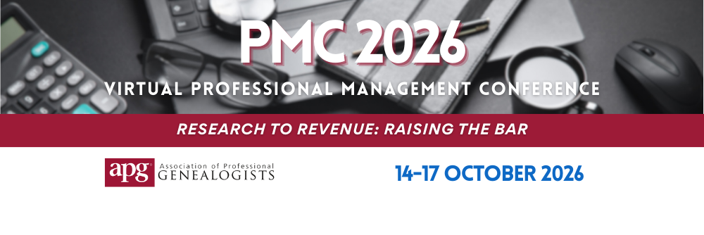 The Association of Professional Genealogists (APG) will hold its 27th annual Professional Management Conference (PMC) from 14–17 October 2026. The APG PMC will be held virtually. This year's theme is "Research to Revenue: Raising the Bar."